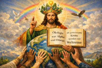Daher war die Zeit um, an einen abgeschriebenen, aufgrund der natürlichen Gesetze totgesagten, aber zu glaubenden wundersam eingreifenden Macher, eine geheimnisvolle Macht zu glauben. Worauf sich damals gegenseitig umbringende, wie einen Wirtschaftsweltkrieg entfachende angebliche Gotteskrieger in aller Welt beriefen. Und dass Weisheit im Sinn (Vater) von Ökologie (Wort, Sohn) nicht nur vergeblich gewollt werden darf, sondern zur verhaltensbestimmenden Gesinnung, gemeinsamen Krone „Christus“ werden muss. Das war Voraussetzung für Zukunft geworden. Das war nicht nur für die Lösung der ökologischen Probleme, Bewältigung drohender Katastrophen, sondern das Gelingen der Staaten in demokratische Freiheit unabdingbar geworden.